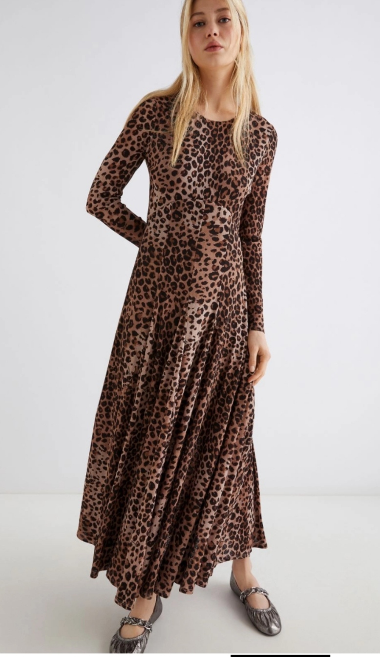 Vestido en punto en print de leopardo , cuerpo ajustado y falda con vuelo.